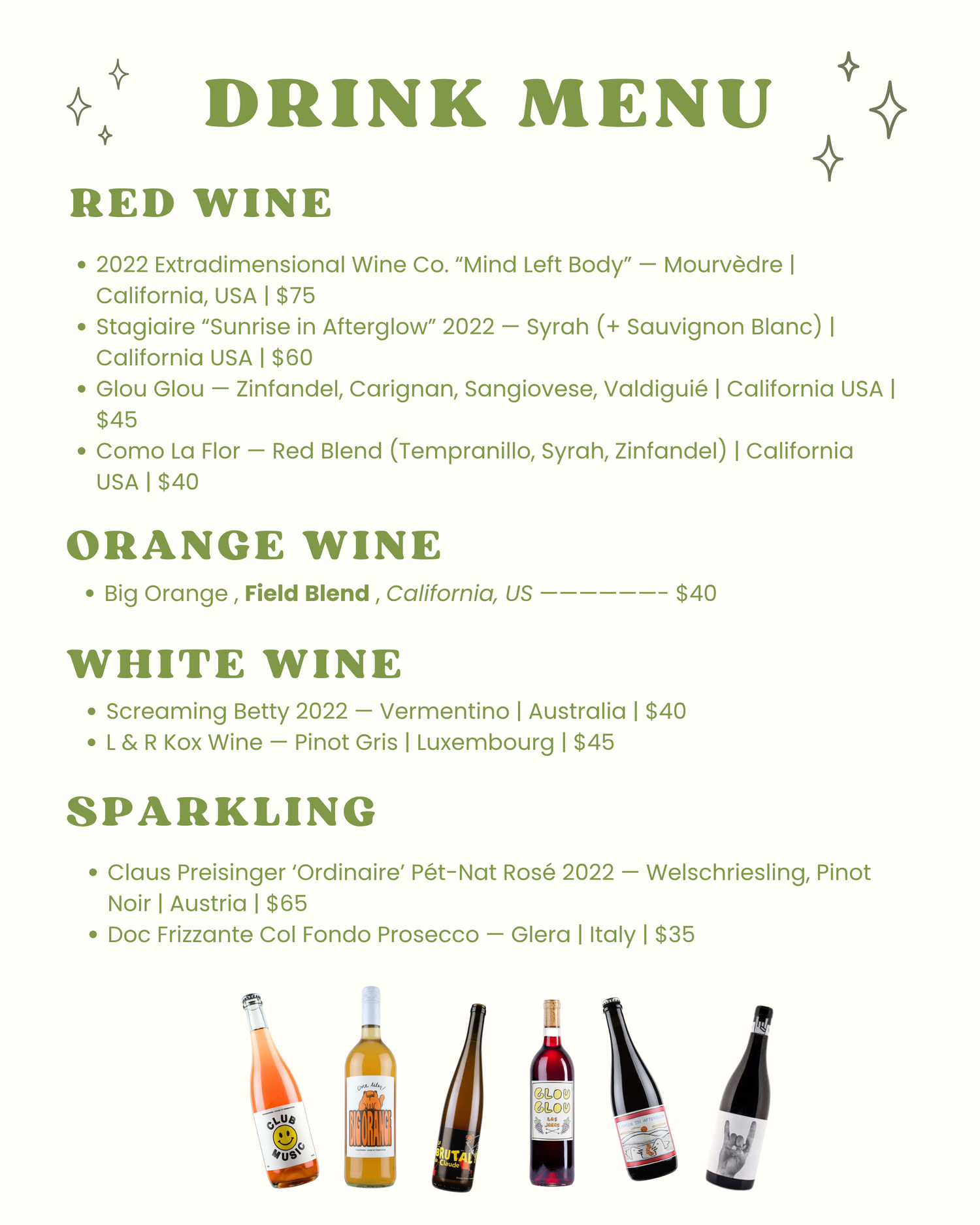 Our wine selection is always evolving. We pour natural, low-intervention wines that range from funky and unexpected to more classic flavor profiles. Stop by to see what we’re currently serving—you might find something new to love.