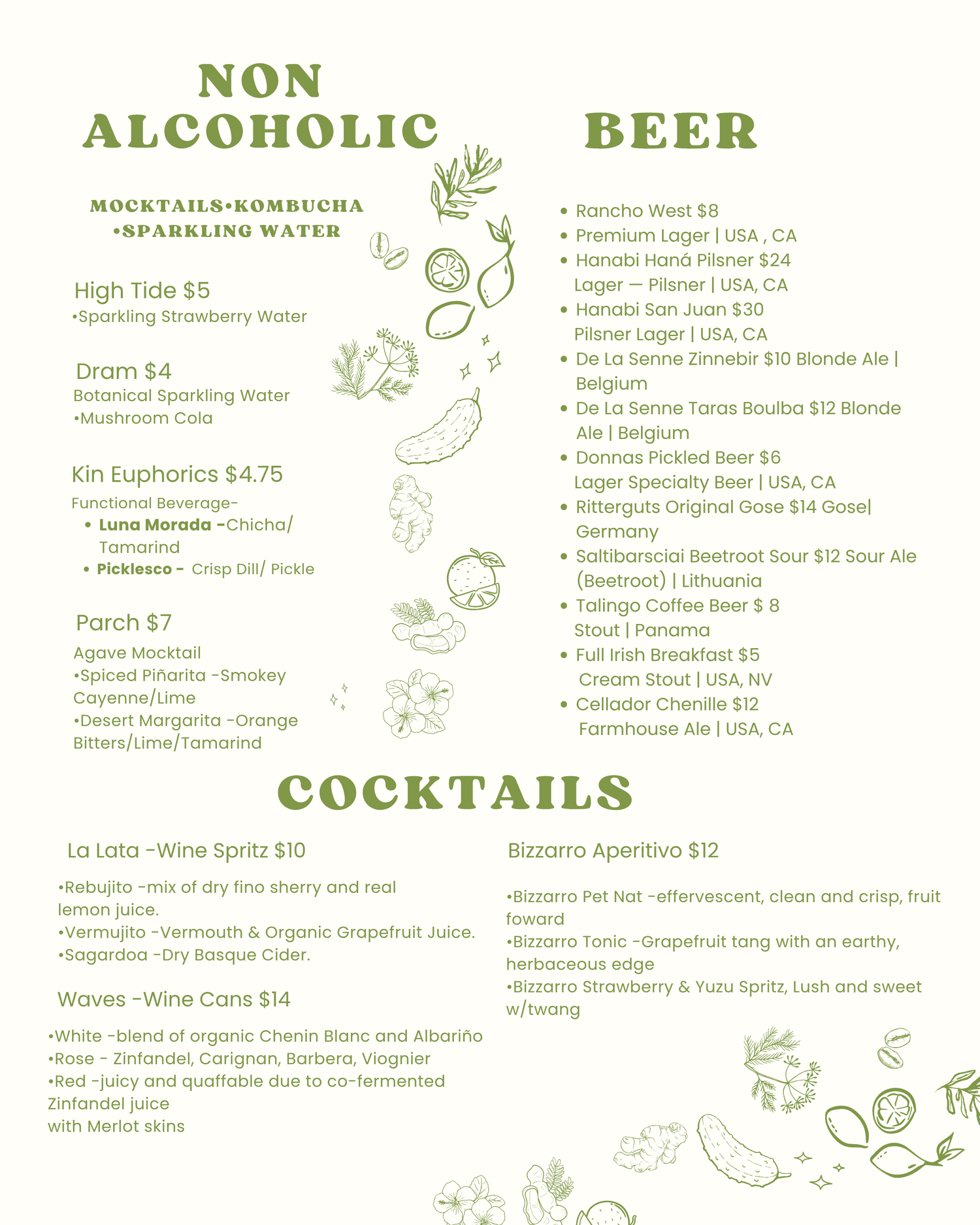 We serve a rotating selection of imported craft beers, including Goses, Sours, Stouts, Pale Ales, and more. The lineup is always changing, so stop by to see what’s on tap.