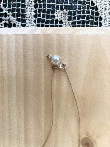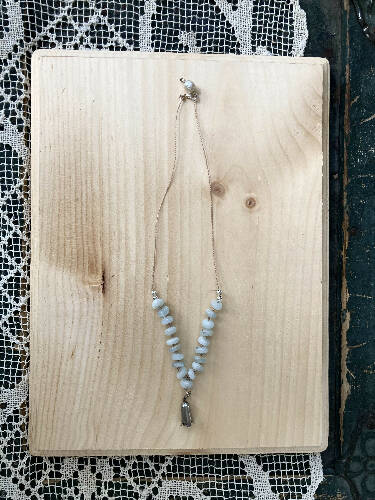 One of a kind necklace made with aquamarine rondelle beads, a vintage sterling silver charm, and pearl closure. Strung on a very soft but very strong cord. 17 inches.1