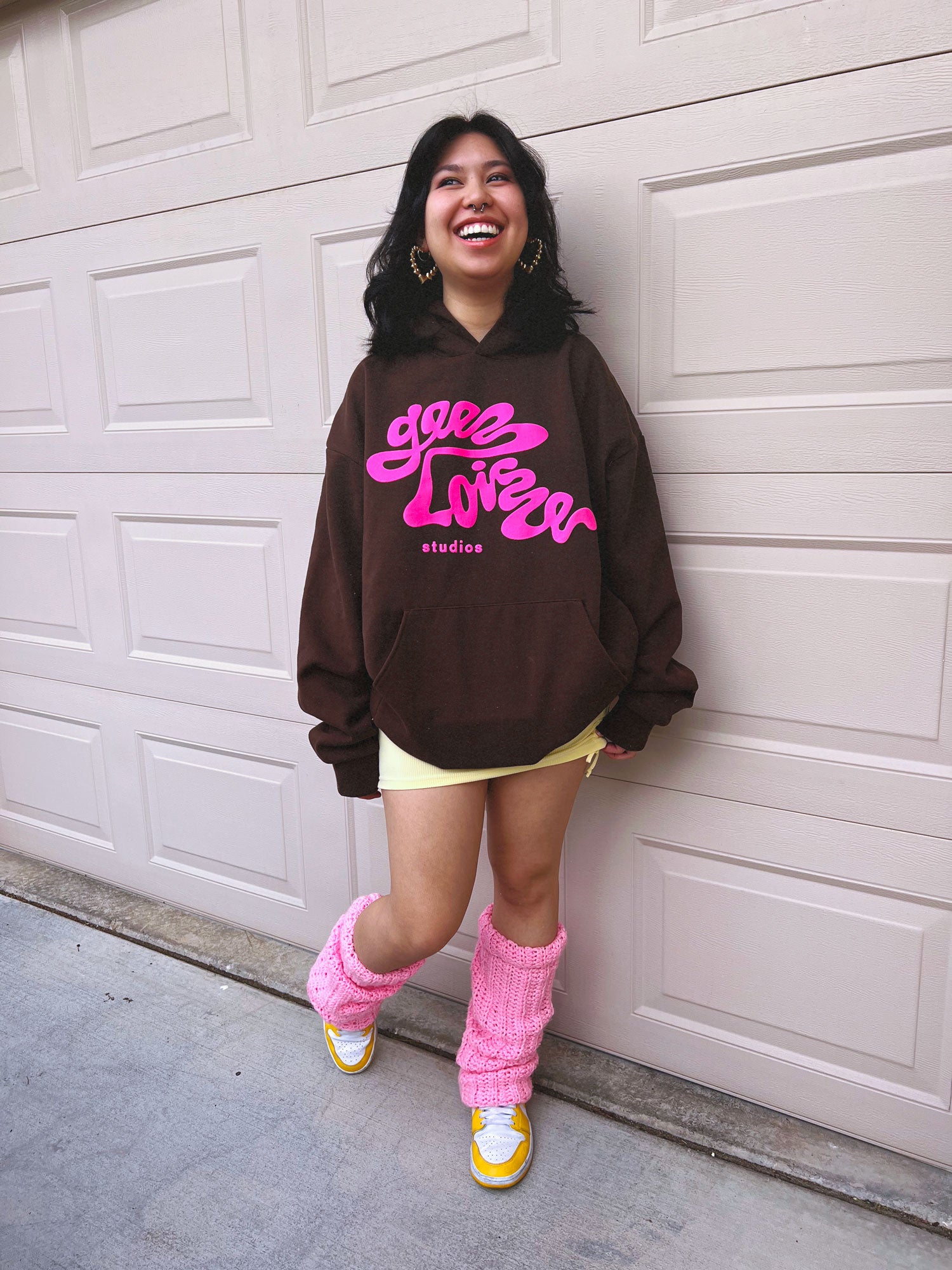 Step into your new season of growth with the Blooming Era Hoodie. This warm, earthy brown hoodie has a boxy fit with a drop shoulder. It blends vintage-inspired streetwear with modern comfort, featuring a bold pink retro script logo printed in puffy ink on the front and a vibrant floral design on the back.