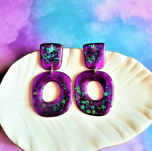 These Bosa Earrings feature a two-piece design with a circular statement format. The earrings come in clear with glitter and a tinted color, available in various shades.
