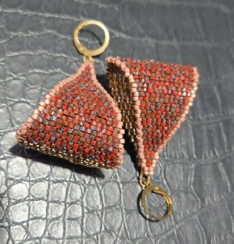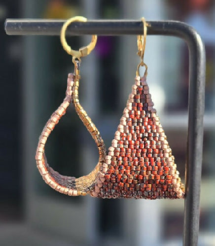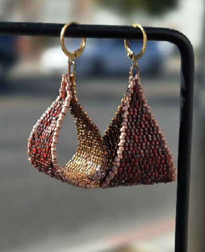Each pair is completely one of a kind. No two will ever be the same, making it almost like getting two earrings in one. One side features a gold metallic finish, while the reverse reveals a rich red mix—what we call a Berry Picasso bead—finished with a soft mauve edge for contrast and depth.