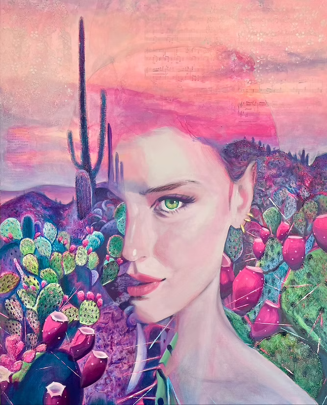 Sticker of the art piece “Desert Darling”. Purple and pink sunset skies dance through the colorful cacti.