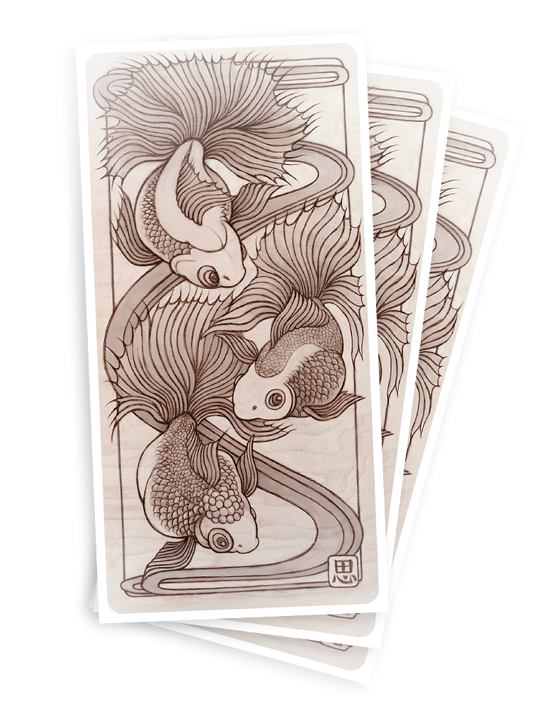 Illustration of three Goldfishes drawn with sepia ink and watercolor on wood by Sze Jones. Artwork symbolizes growth, abundance, and progress.