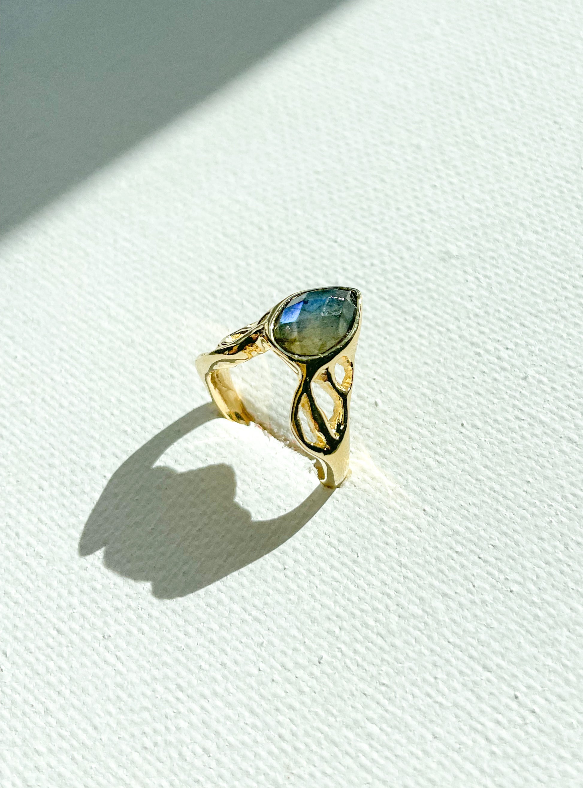 Featuring a hand carved band with organic detailing + natural custom rose cut Labradorite.