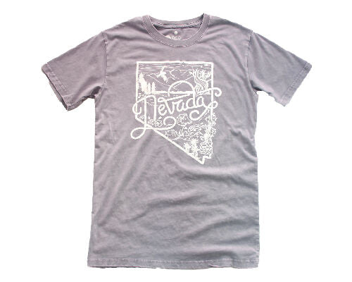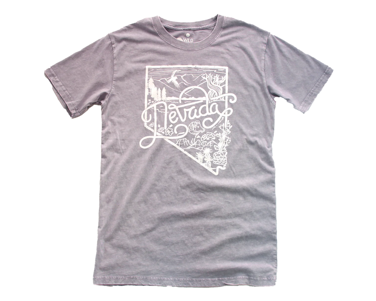 Hello new favorite! Too soon?đ This is our attempt at creating a tee with all the awesome nature that Nevada has to offer. Even though we couldnât fit everything, we've included some highlights. Happy trails, Nevada friends. Cool hand-drawn design printed on a stone-washed lavender tee.Â