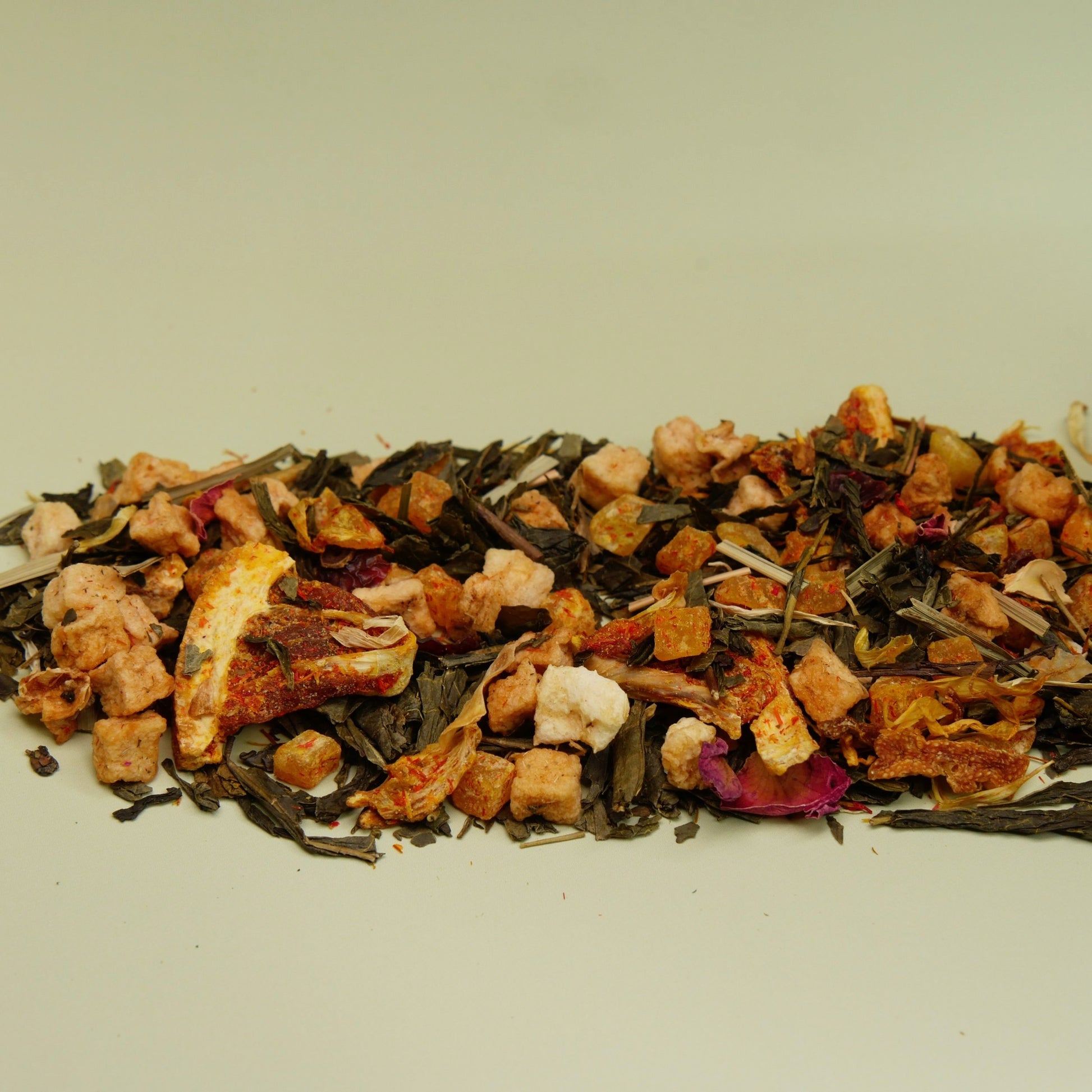 Organic Green Tea Leaf, Lemongrass, Rose, Mango, Apple, Marigold, Safflower, Pineapple, & Orange