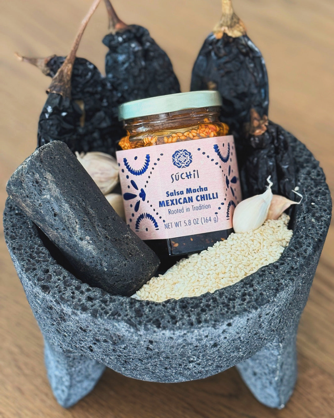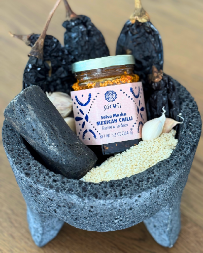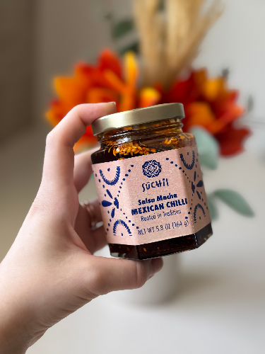 Suchil’s Salsa Macha is a luxurious blend of smoky dried chiles, heirloom corn tostadas, fresh garlic, and toasted sesame seeds. This exceptionally versatile chili oil elevates everything from pizza and pasta to salads, tacos, and more. Try it as a bold marinade for chicken, fish, or steak—the possibilities are truly endless.