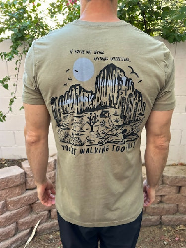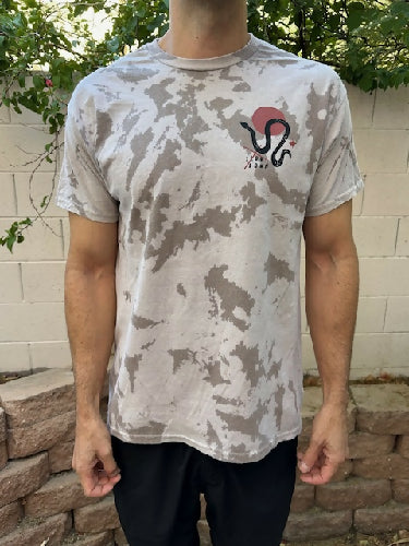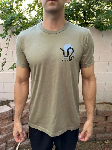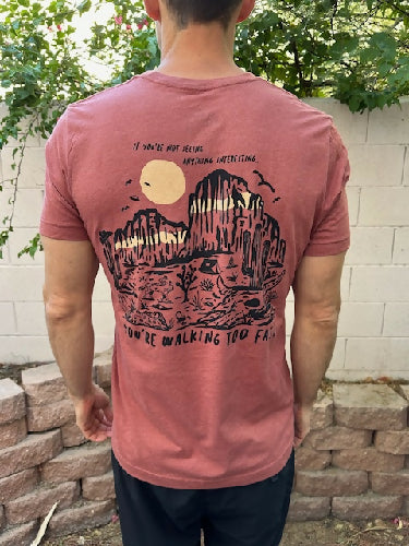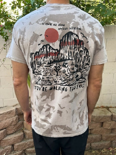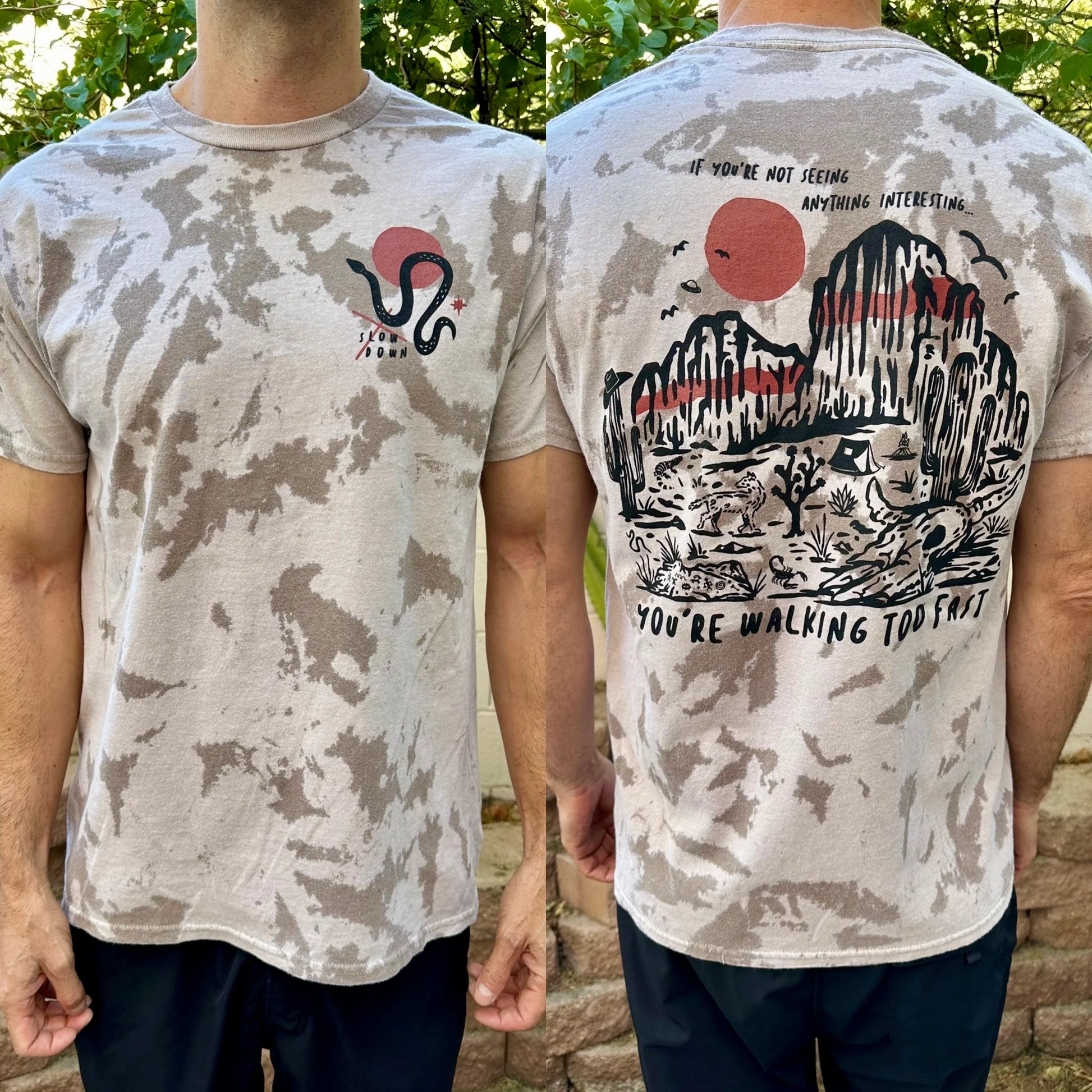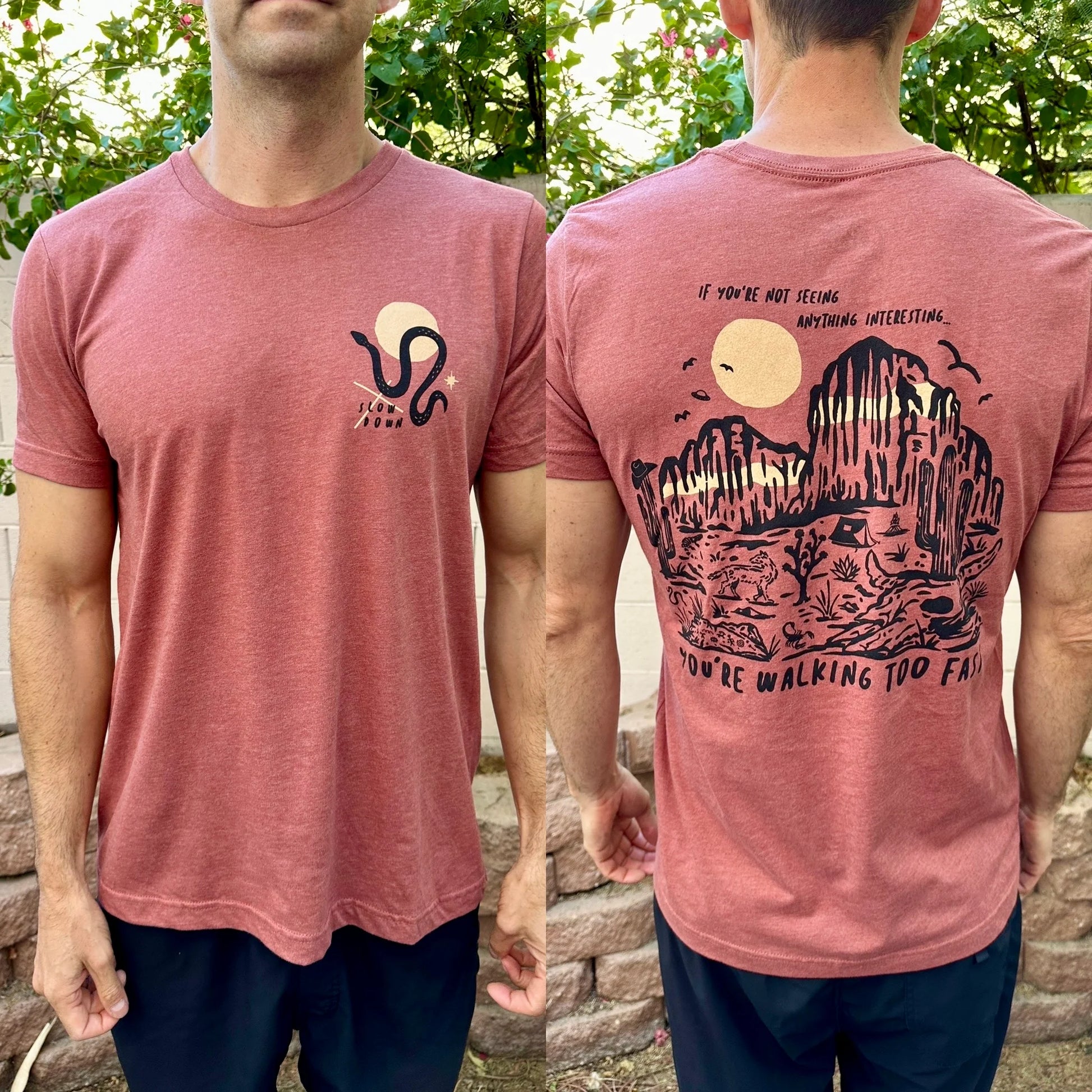Introducing the Slow Down tee!! These shirts feature a landscape graphic on the back of my interpretation of Red Rock Canyon mountain range AND one my favorite quotes, "If you're not seeing anything interesting.. you're walking too fast". It's a personal reminder to be present, look around, enjoy whats in front of you.... and the longer you look at the landscape you might just find some interesting surprises;) The front also has a snake/moon graphic on the left chest area.